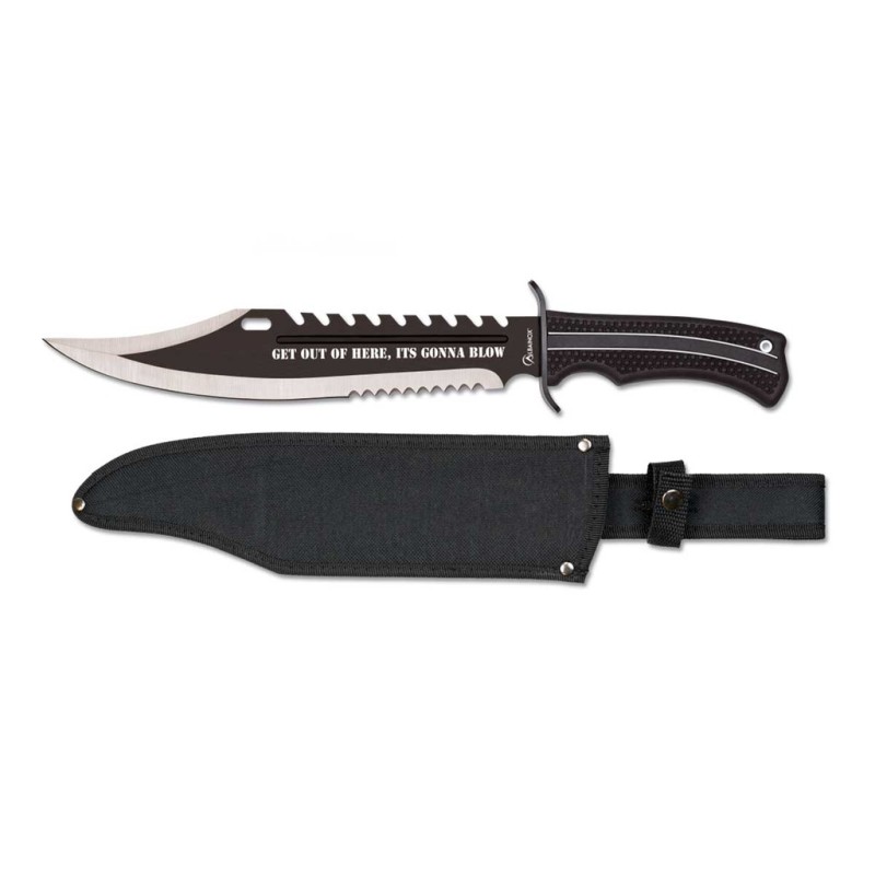 Albainox nos presenta un cuchillo de 29cm con un diseño táctico y muy atractivo, fabricado en acero inoxidable, cuenta con dos sierras una en la parte superior e inferior de la hoja. Tiene un mago engomado que mejora el agarre. La funda está fabricada en nylon color negro.