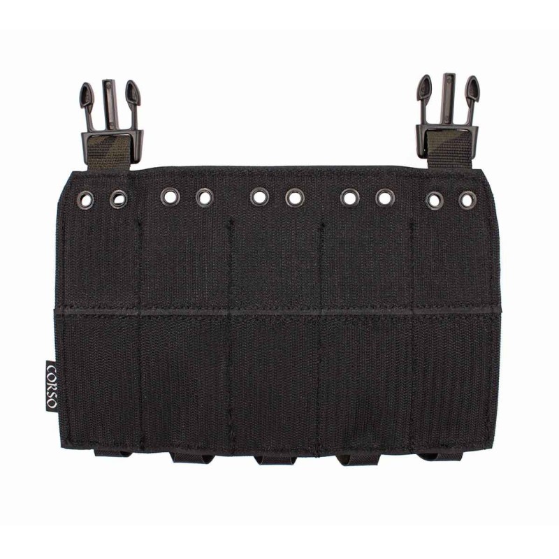 Corso nos presta su nuevo panel frontal Dagger, diseñado especialmente para alojar de la forma más segura, firme y cómoda posible cargadores de subfusiles del tipo MP5, MP7 y variantes similares, además también es compatible con cargadores extendidos de pistolas, esta polivalencia es gracias a su ingenioso sistema de bandas elásticas que se adaptan perfectamente a la forma de estos cargadores a su vez nos brinda una sujeción optima, suficientemente firme para evitar que los cargadores se muevan con el movimiento pero suficientemente suave para facilitar su extracción rápida en el momento preciso, además el pouch cuenta con cuerda elástica superior que proporciona un extra de seguridad.