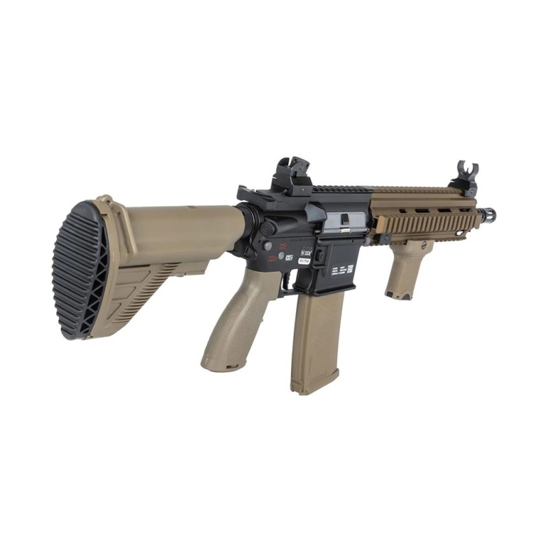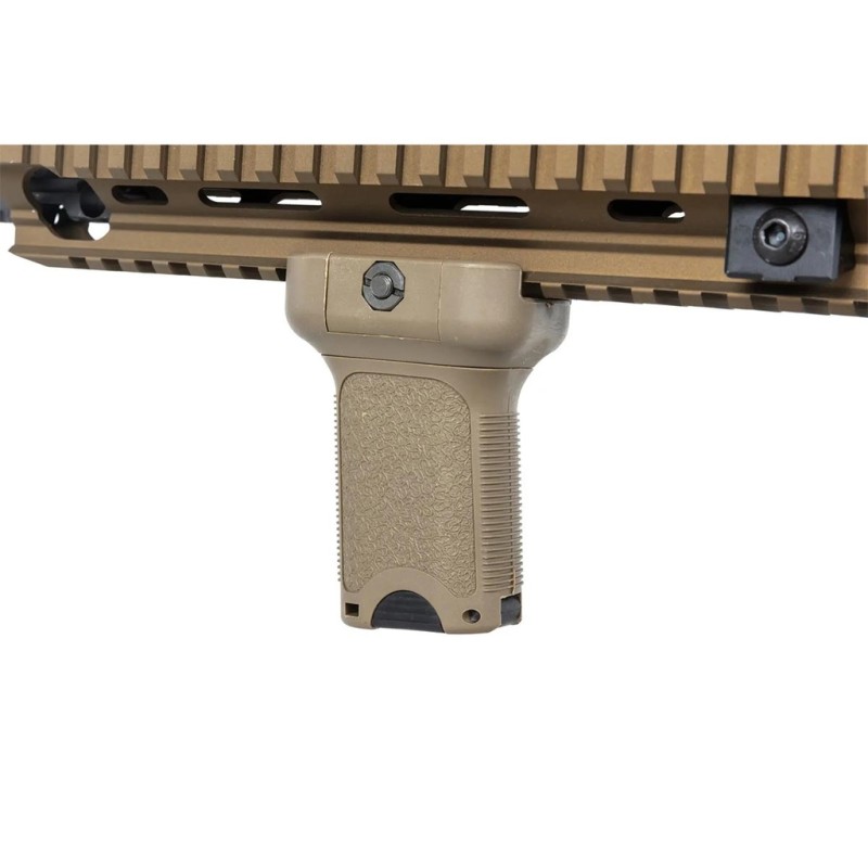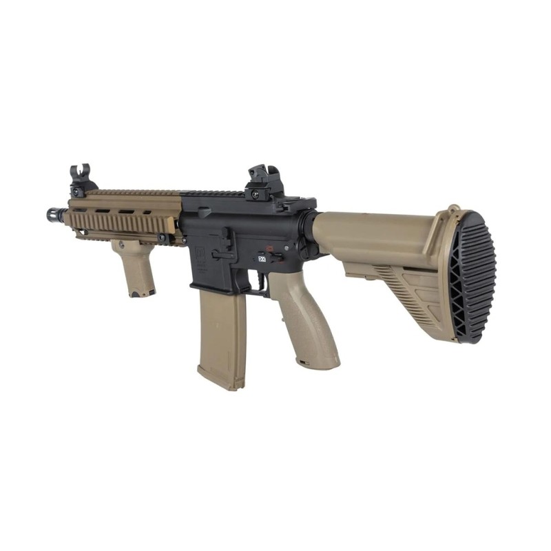 El nuevo fusil PRIME SA-PH20 HAL ETU de Specna Arms destaca por su hermoso diseño inspirado en los famosos fusiles HK 416 de Heckler & Koch, el cual fue presentado en 2005 y rápidamente se convertiría en el fusil favorito de múltiples cuerpos militares que buscaban un sustituto ideal para sus antiguos fusiles. Este fusil fue diseñado para mejorar las capacidades operativas del antiguo M4A1 y lo logró, el fusil dispone de un ancho guardamano cubierto con raíles estilo Picatinny que nos otorgan la posibilidad de instalar una gran cantidad de accesorios tácticos como grips, linternas, láseres o incluso sistemas AM/PEQ. El cuerpo dispone de un diseño muy robusto y solido acompañado de una empuñadura diseñada especialmente para proporcionar la máxima ergonomía posible, está a su vez dispone de una superficie antideslizante que nos brinda un agarre mucho más firme y cómodo. Por último en cuanto al diseño, la réplica equipa una estupenda culata retráctil que se caracteriza por poseer un espacio interior bastante amplio, haciéndola compatible con una gran variedad de baterías, adema en la parte posterior de la culata, contamos con una tapa de goma bastante gruesa que nos brinda una superficie de apoyo increíblemente cómoda.