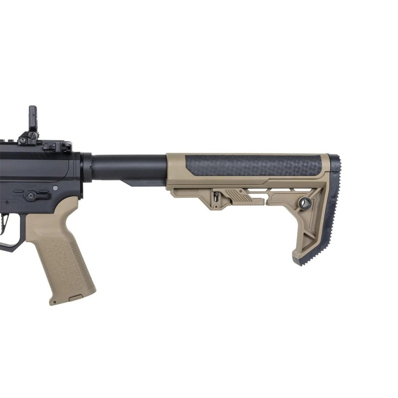El fusil FLEX Gen2 SA-FX02 HAL ETU forma parte de la innovadora Serie X de Specna Arms, una línea que se distingue por ofrecer réplicas compactas con estética de subfusil, inspiradas en las modernas variantes del AR15 en calibre 9x19mm, muy populares entre los entusiastas del mercado civil estadounidense por su tamaño reducido y gran maniobrabilidad. Este modelo ha sido diseñado pensando en la acción rápida y los entornos CQB, combinando dimensiones contenidas con una funcionalidad sobresaliente. Incorpora un guardamanos M-LOK estilizado y delgado, equipado con raíles Picatinny estratégicamente ubicados para montar accesorios como linternas, láseres, grips o unidades AM/PEQ, todo ello sin comprometer la comodidad del agarre gracias a su perfil estrecho que facilita un manejo más ágil. Su cuerpo sólido integra una empuñadura ergonómica con superficie texturizada, brindando un control firme incluso en situaciones de juego intenso. La culata de tipo light ops, ajustable en longitud, permite adaptarse a diferentes usuarios y situaciones, además de ofrecer un espacio interno generoso para acomodar baterías de distintos formatos. Como toque final, el modelo viene equipado con un gatillo recto que mejora la respuesta al disparo, aportando mayor superficie de contacto y mejorando así la sensibilidad y precisión al accionar.