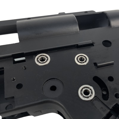Reinforced V2 gearbox shell made from high-strength alloy, designed to handle upgraded builds. Includes pre-installed 8 mm ball bearings for smoother operation and reduced friction. Reinforced around stress zones such as the cylinder window and spring guide. Compatible with most standard V2 components.