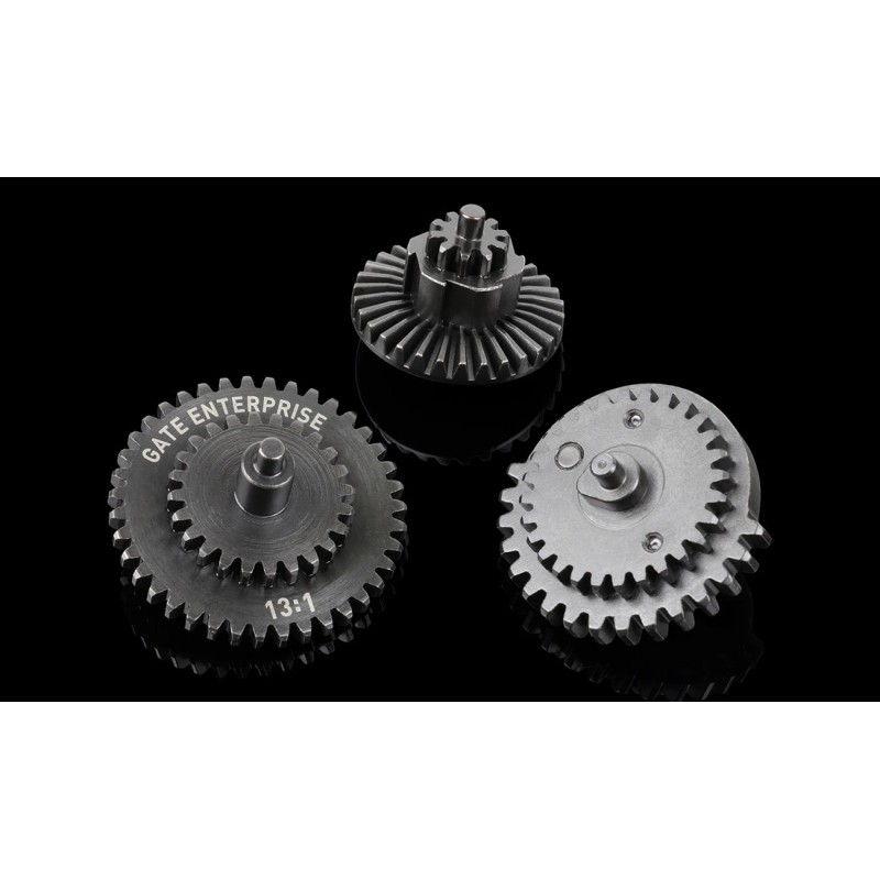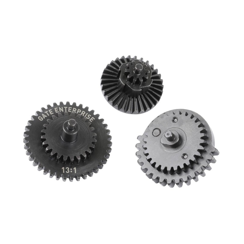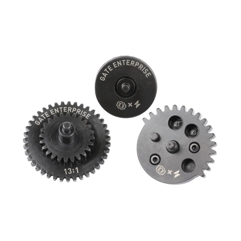 Set de engranajes CNC 13:1 en acero, compatible con muelles M160 (semi) y M140 (full), posicionamiento preciso del pin de tappet plate para mejor sellado.